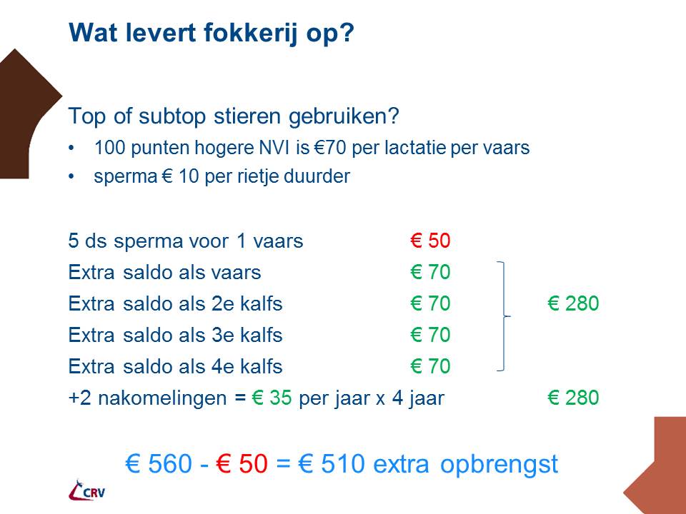 De ruwe kosten voor het maken van een rietje sperma is ongeveer een kleine euro, de rest is overhead, development en marketing. Dus over een tijdje is het net als bij de varkens, de krijgt een naamloos product voor een goedkope prijs. Weer wat charme van het boerenbestaan weg. Maar de KI bedrijven hebben hier doelbewust voor gekozen door anonieme genomics stieren (op gegeven moment zelfs als pakketje) in de markt te zetten. Ook van deze run naar de bodem qua prijs gaat uiteindelijk niemand gelukkig worden, want zonder premium ook geen innovatie en dus aan het eind een doodbloedend systeem van massaproductie.
